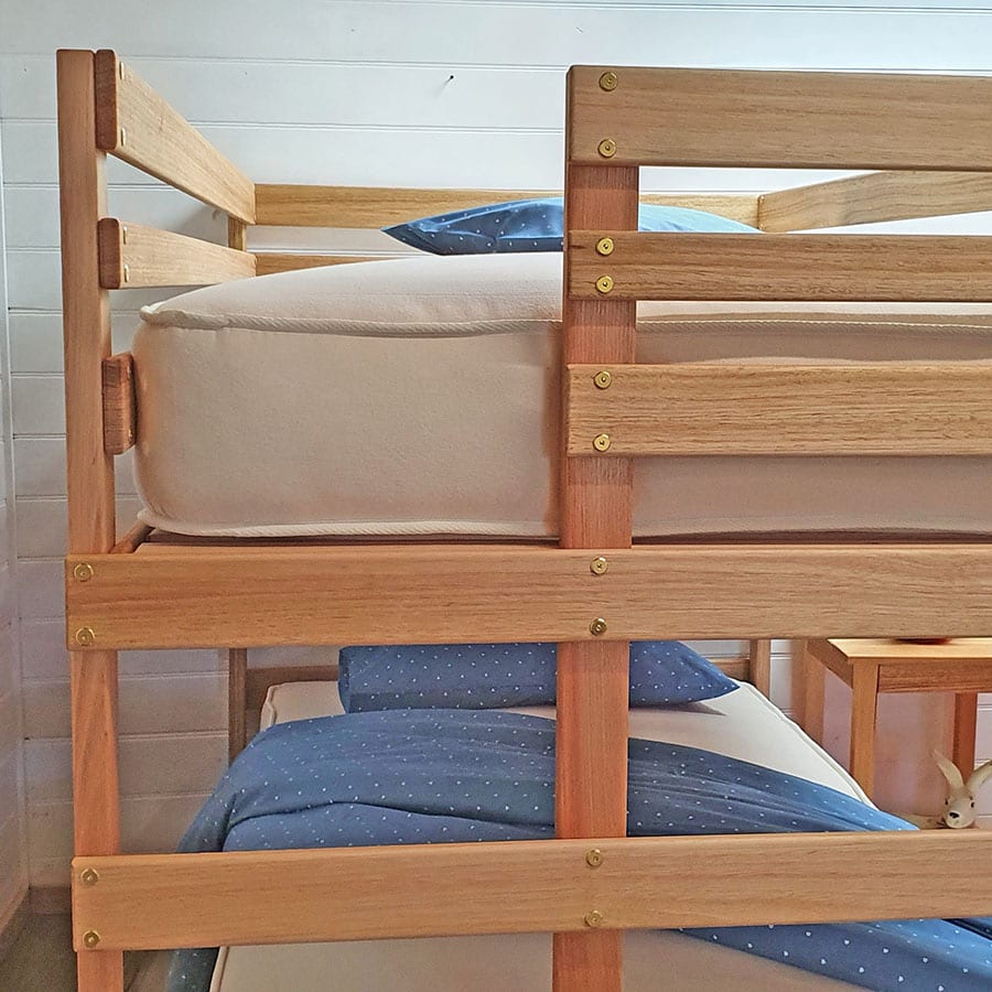 MADE TO ORDER in our craftsman's workshop in South Gippsland, using Victorian Mountain Ash from managed plantations. 100% Australian hardwood bunk, NO MDF, No Chipboard, No toxic glues. No chemical paints or finishes and definitely NO fumigation.