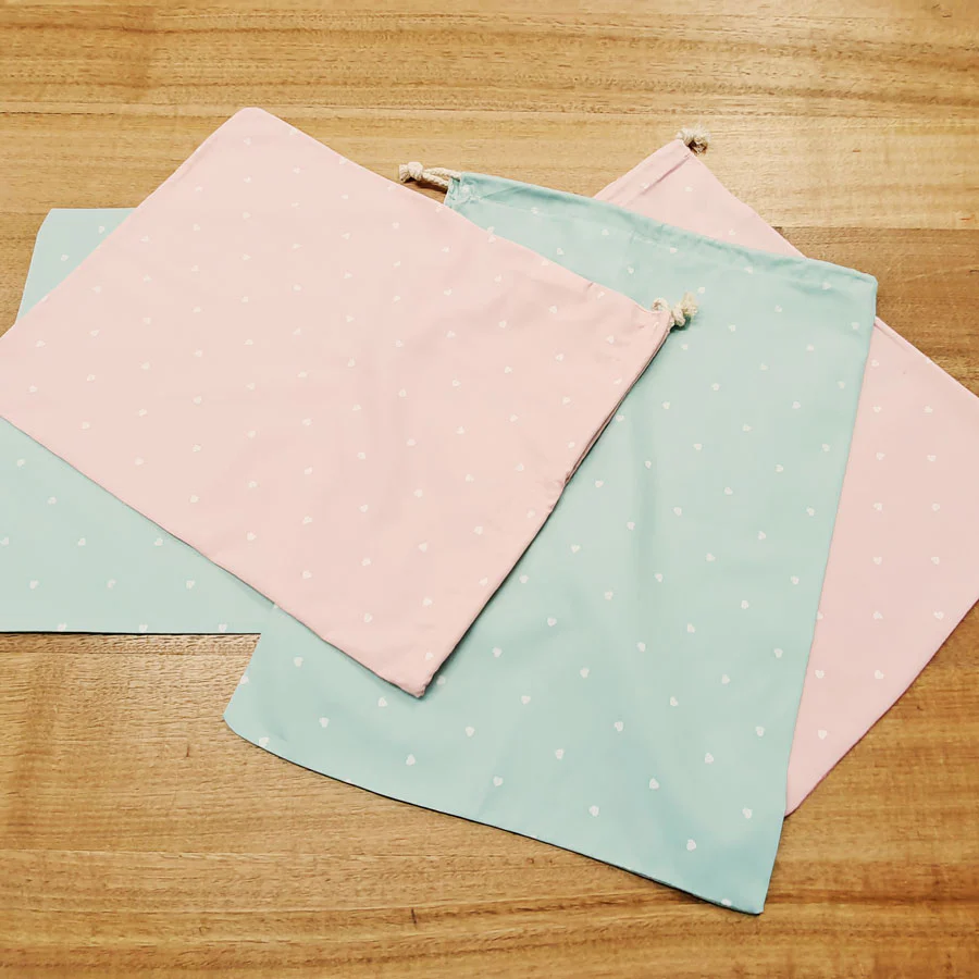 These sweet Kinder Bags are 100% Organic Cotton Poplin with a small drawstring top with natural cotton cord. They are perfect for carrying or storing items for your little ones.