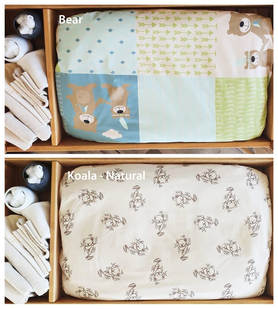 Organic Cotton Fitted Sheet for our Change Table Mattress. Made in Australia from 100% pure Organic Cotton Poplin in a variety of our most popular colours and prints.